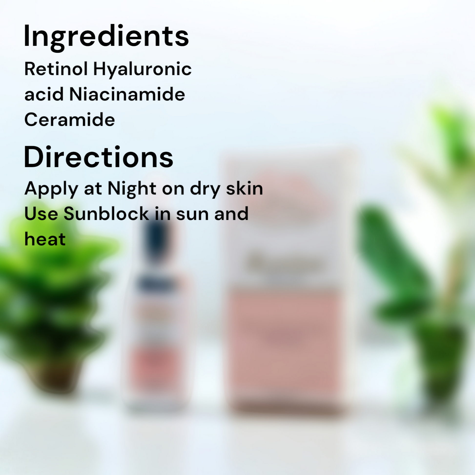 This youth potion combination of Retinol, Hyaluronic acid is specially designed to reduce fine lines and give hydrated look. Niacinamide decrease pores and texture on your skin which comes with age. Ceramides prevent further damage to skin and preserve your beauty.
